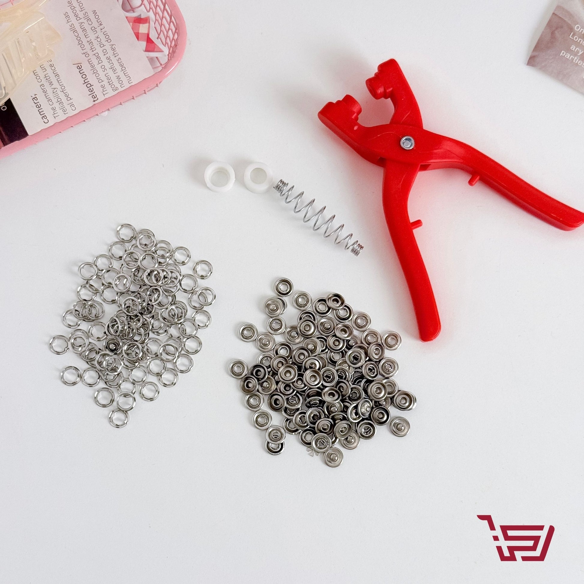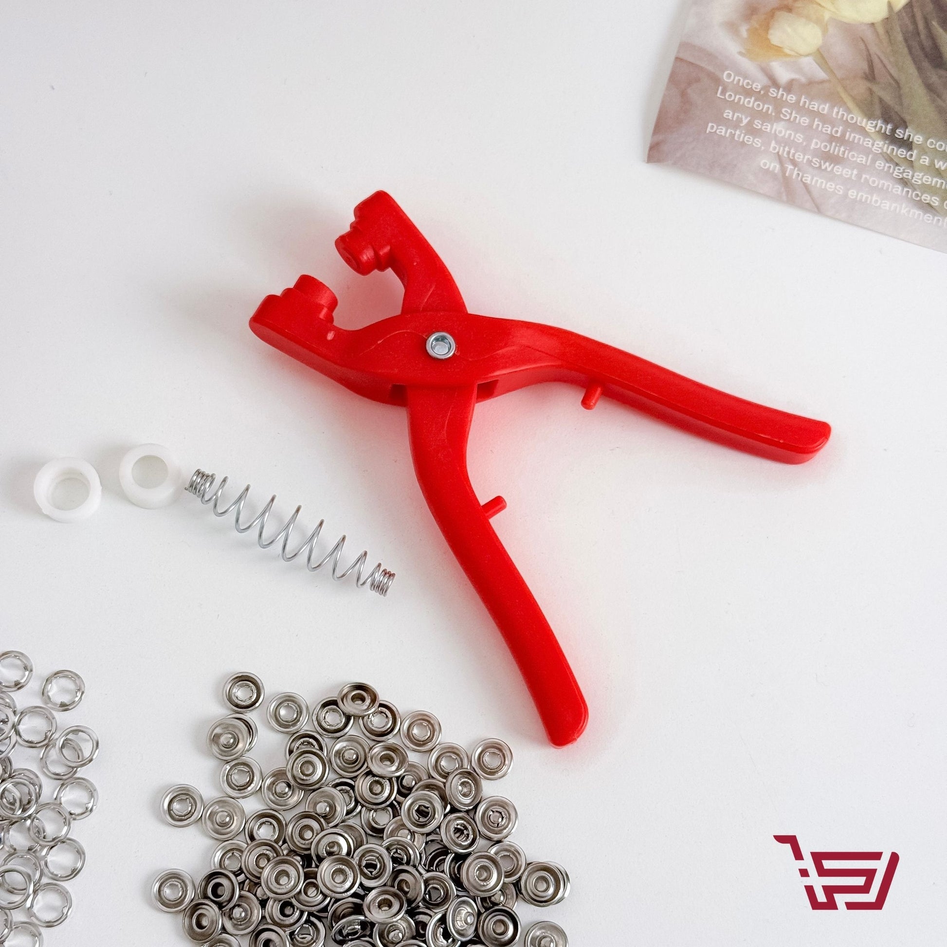 يأتي الطقم بمقبض بلاستيكي مريح وعدة أزرار معدنية، ويُستخدم لتثبيت الأزرار على الجيوب، الأكمام، الحقائب، أو أي مشروع خياطة.